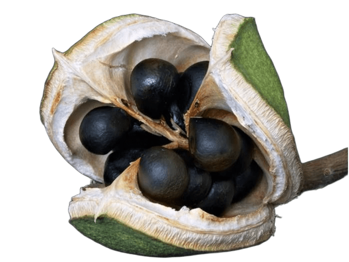 Плоды представляют собой округлые коробочки диаметром около 5–7 см, внутри которых содержится от 10 до 20 съедобных семян. По мере созревания оболочка растрескивается, открывая тёмно-коричневые орешки, которые употребляют в сыром и жареном виде. Они отличаются своей полезностью и вкусом.